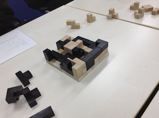 Stew Eucenさんの猫シリーズ、ネコリス。テトリスのように、16個×2色のテトラキューブを4方から挿入して組み合わせていきます。相手に合法手がなくなるか、色に関係無く駒が2段目に1列並んだら勝ちです。前半の布石が、冗長なところがあるという意見がありました。1段目の配置でも、決着が着くようなルールを挿入するアイディアが出て、こちらのルールの方がゲーム全体に締まりがあるようでした。
