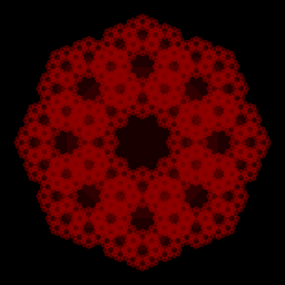 右の図は、プログラムによって描いた図形です。描き方は、各階層の円を描き、一つしたの階層に8個の円を機械的に配置する作業を再帰的におこなっています。そこで、図を良く見てください(クリックすると拡大します)。場所によって、円の色が濃くなっているところがあります。まるで、円盤を積み重ねたように見えるかと思います。プログラムで描く円は、半透明処理が施してあるので、繰り返し描かれた位置が濃く浮き出るように描かれています。